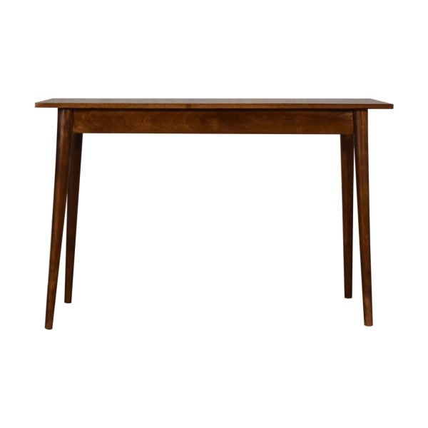 This nordic writing desk is a contemporary and well put together item. With 2 drawers it allows easy access to all equipment you may need at the hands of your desk. Its beautiful design helps allow it to fit your personal taste whether you are going for a more modern or classical approach. This is made of 100% solid mango wood with an chestnut finish.