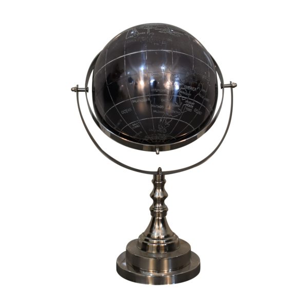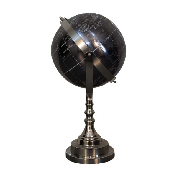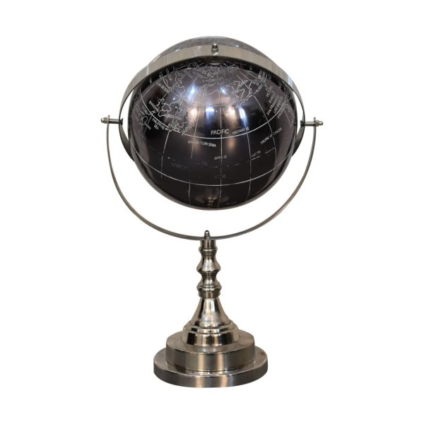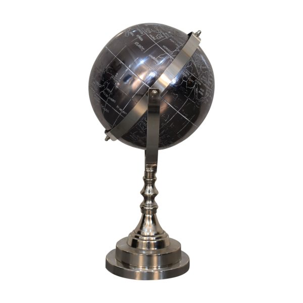 The chrome globe is created from metal and boasts a lovely shiny finish. The spherical globe features loose engravings, depicting the world map. The relaxed nature and style of the frame creates a striking contrast with the smooth metallic finish of the globe and the black map. This product is handcrafted individually and as every piece is unique please do expect variations in finish, texture, size and should not be considered as a defect.