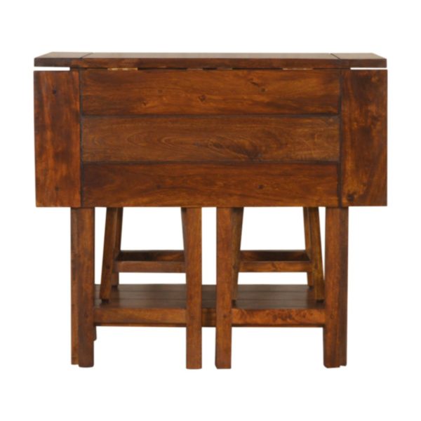 This breakfast table set is fully constructed from 100% solid mango wood and has a rich chestnut finish. It comes with 2 strong and compact little wooden stools, which are very sturdy yet light enough to move around easily, and can be tucked away on the shelf under the table when not in use. It is ideal for small kitchens but can also be extended when needed. The perfect addition to any kitchen.