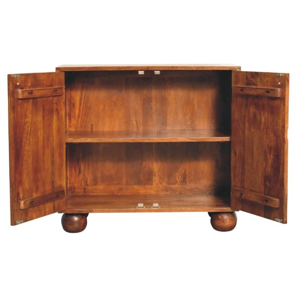 This Chestnut Dice Cabinet has been inspired by a clean and modern design. It has been constructed from 100% solid mango wood in a chestnut finish and features 2 doors that have a fading dice pattern that blends beautifully with the grain pattern of the wood. Other features include chunky ball feet and shiny knobs.