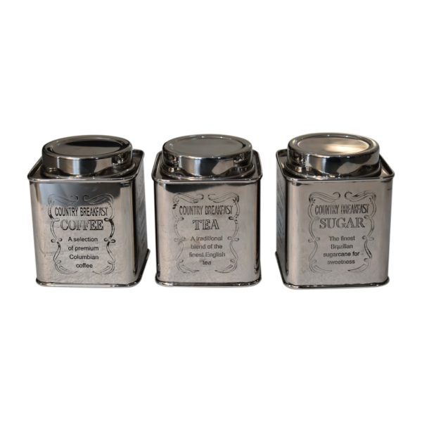 Keep your kitchen worktops neat and tidy with our tea, coffee, and sugar storage set. Each jar offers a sleek and simple design in a square shape and has a shiny chrome finish, perfect for everyday use. This product is handcrafted individually and as every piece is unique please do expect variations in finish, texture, size and should not be considered as a defect.