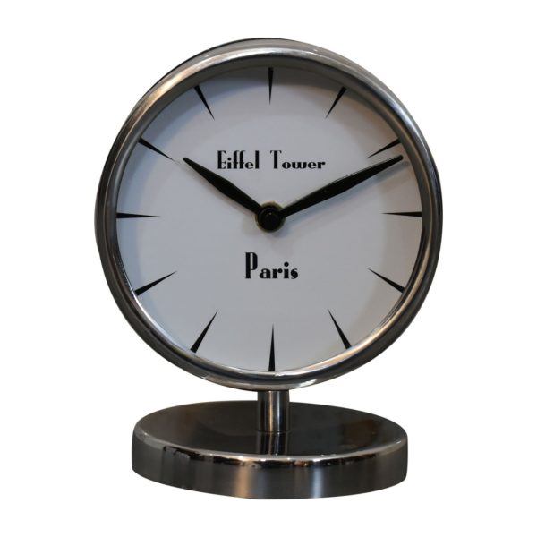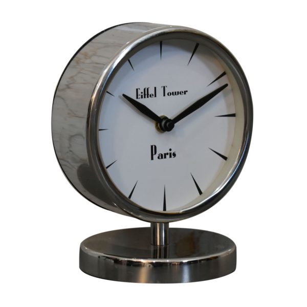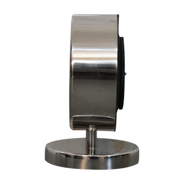 This round clock is a sleek addition to your bedside table. It offers a chrome frame and base with a simple face and overall minimalist look that will blend with many décor styles.