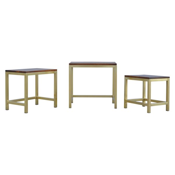 The stool set of 3 is the perfect accent piece for your home. The top has been constructed from 100% solid mango wood in a chestnut finish with a beautiful brass gold base. The 3 different sizes means they can be used together or in a different room and are convenient as they can be stacked on one another.