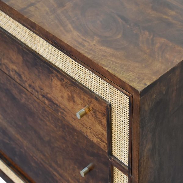 This stylish Chestnut Woven Chest combines smooth chestnut drawers and legs, surrounded by a light woven design giving the piece a beautiful contrast. Constructed from 100% solid mango legs it features 3 spacious drawers perfect for storage, shiny knobs on the drawers, and nordic style legs. Make full use of this chest in your bedroom and partner it with the rest of the collection.