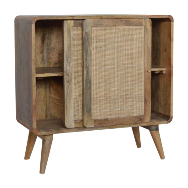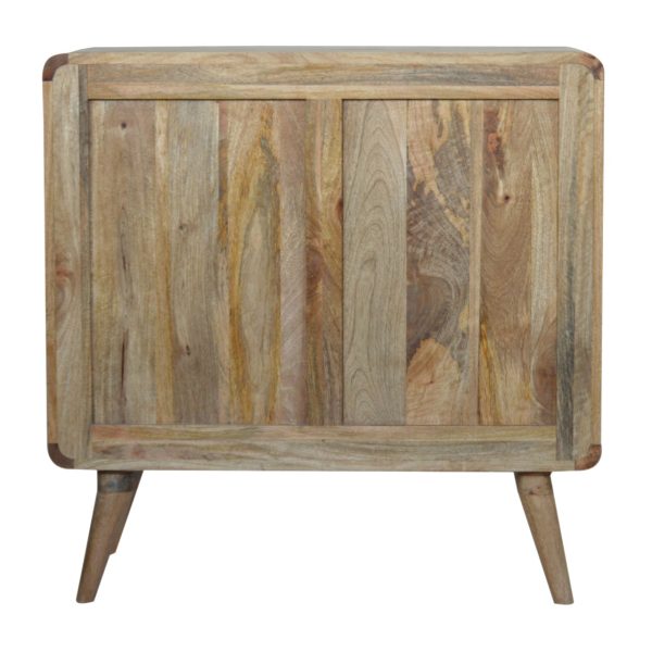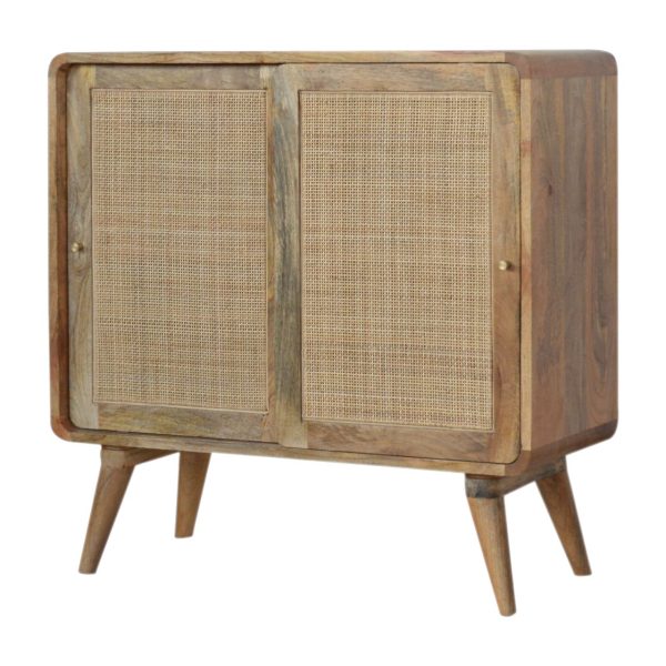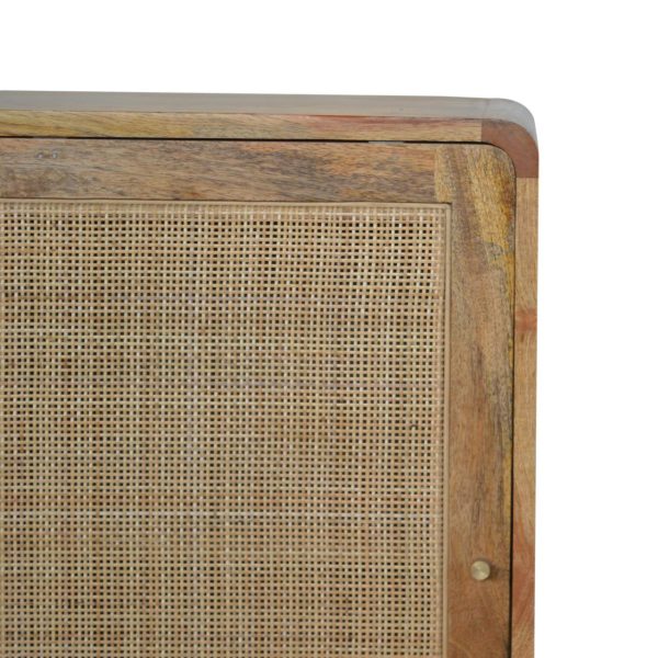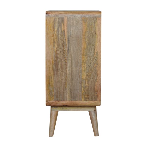 This stylish Nordic Close-knit cabinet combines a woven door front with a smooth oak-ish finish body and legs. Constructed from 100% solid mango legs it features 3 spacious drawers perfect for storage, a shiny knob son the drawers, and nordic style legs. Make full use of this cabinet in the living room and partner it with the rest of the collection.