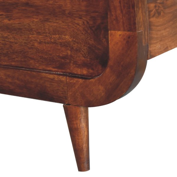 Experience the ultimate in elegance with our Curved Mango Wood Double Bed. Crafted from 100% solid mango wood in a rich chestnut finish, the headboard and footboard showcase exquisite curves. This masterpiece boasts a metallic frame with 18 wooden slats, ensuring durability and comfort. Nordic-style legs add a touch of sophistication. Transform your bedroom into a haven of style and tranquility. The box will contain 1 x headboard, 1 x footboard, 2 x side rails, 1 x metallic frame with 18 wooden slats (embedded in metallic frame), 4 x legs, 1 x hardware bag, total number of units in box = 9 units. Please note the bed does not include the mattress, duvet cover or pillows.