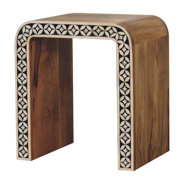 This beautiful boho inspired end table is constructed from 100% solid mango wood and has a fine oak-ish finish. The bone inlay is sourced responsibly from deceased animals such as camels, goats, and buffaloes.