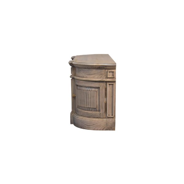 Introducing our beautiful serpentine media unit, expertly crafted from 100% pine wood. The aged/weathered finish adds a vintage charm, while the shiny brass knobs and handle create a unique contrast. With ample storage space, it’s a stylish and practical addition to your living room.
