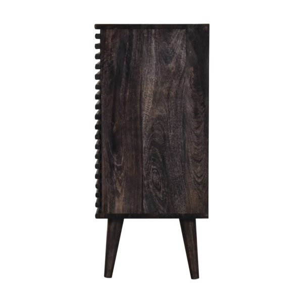 Perfect for storing and displaying books, photo albums or vases our Kobe Cabinet is a ultra-practical piece with a trendy Mid-Century Modern meets Scandi look. Constructed from 100% solid mango wood in a ash black finish, this elegant piece of furniture showcases a ridged design on the cabinet door giving the piece dimension and texture. Use it in the living room or the hallway as a multifunctional piece.