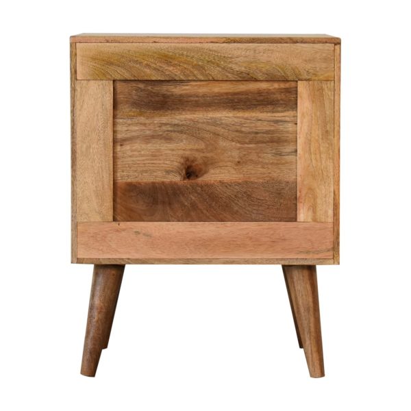 The Larissa bedside will stand out in your interior thanks to its understated look and subtle originality. The beautiful grain pattern and rattan design do not make this sideboard any less functional. In fact, it features a door with 2 drawers inside which offer plenty of storage space. It has been constructed from 100% solid mango wood in an oak-ish finish and features nordic style legs.