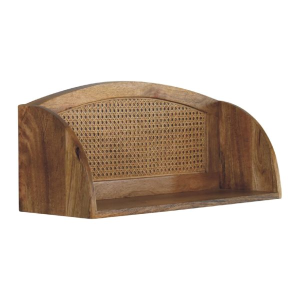 This stylish Rattan Wall Mounted Shelf combines a rattan back with a smooth oak-ish finish body. Constructed from 100% solid mango wood, it is a handy piece for displaying ornaments, plants or candles in the hallway or the bedroom.