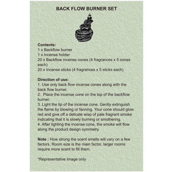 The backflow fountain burner set is exquisitely crafted and features a unique level step design, ideal as a gift for friends and family. The set includes a backflow burner, incense holder, fragrant backflow cones in Tuberose, Rose, Lavender & Jasmine and fragrant incense sticks in Mango, Apple, Pineapple and Orange.