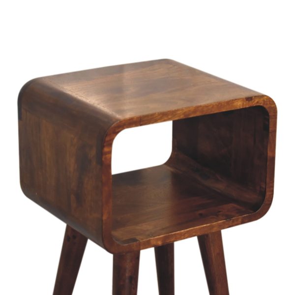 This mini bedside table features a very simplistic and clean design. It has 4 tapered legs, and a chestnut body constructed from 100% solid mango wood. Being a simple piece it features one open compartment for placing any bits and pieces before bed and ample space on top for a lamp, photo frames, or ornaments. Its plain design means it can be matched perfectly with any style of furniture or interior. This petite product is part of Recession Collection.