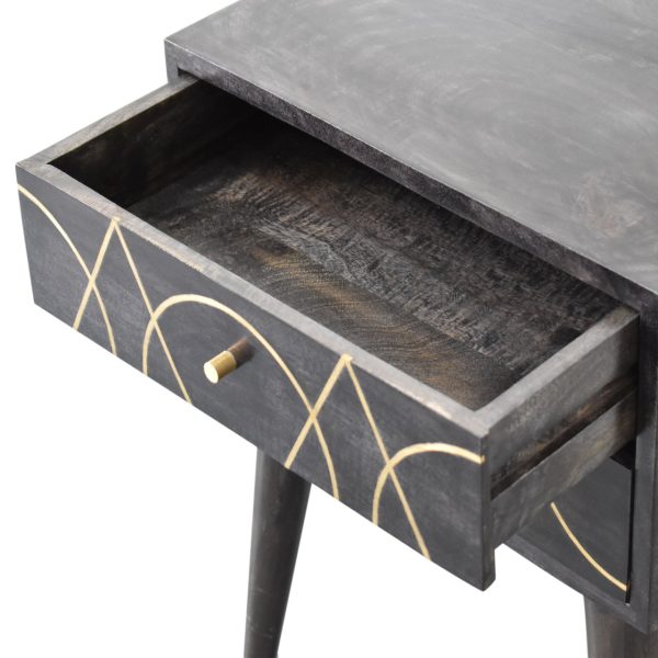 Wake up to a pleasant view every day by adding the Oslo bedside table to your bedroom. It comes complete with two drawers, decorated with a brass inlay pattern, that offer handy storage for your essentials. The bedside is constructed from 100% solid mango wood in an ash black finish and topped with a clear lacquer for maximum protection and durability of the product.