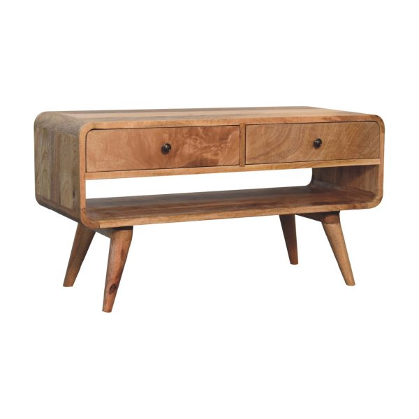 Introducing our reverse solid timber media unit, it is expertly constructed from 100% solid mango wood in a lovely oak-ish finish. This modern design offers clean, curved edges and features 2 drawers that come with a shiny knob, a large open slot to place any books, photo frames, or ornaments, and 4 Nordic style legs.