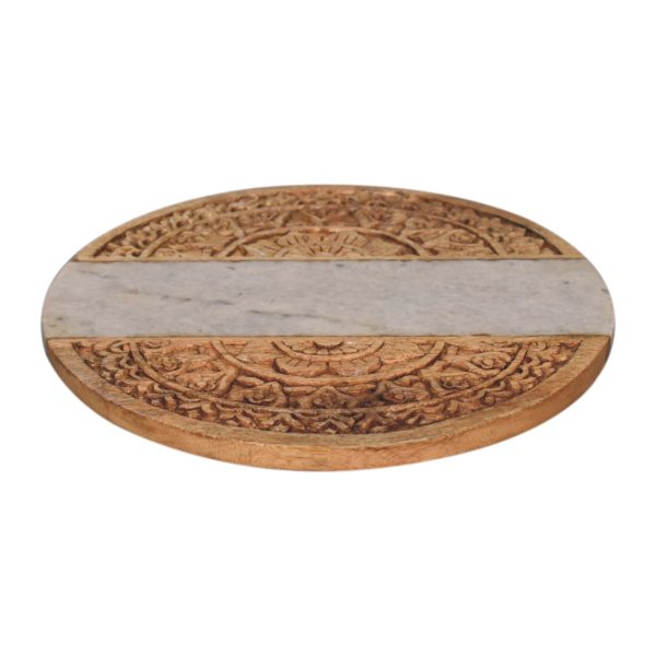 This round carved and marble mixed chopping board is both a beautiful and convenient piece for the kitchen. It features a smooth marble centre and wooden floral carved edges, lovely to add to fresh and modern interiors.