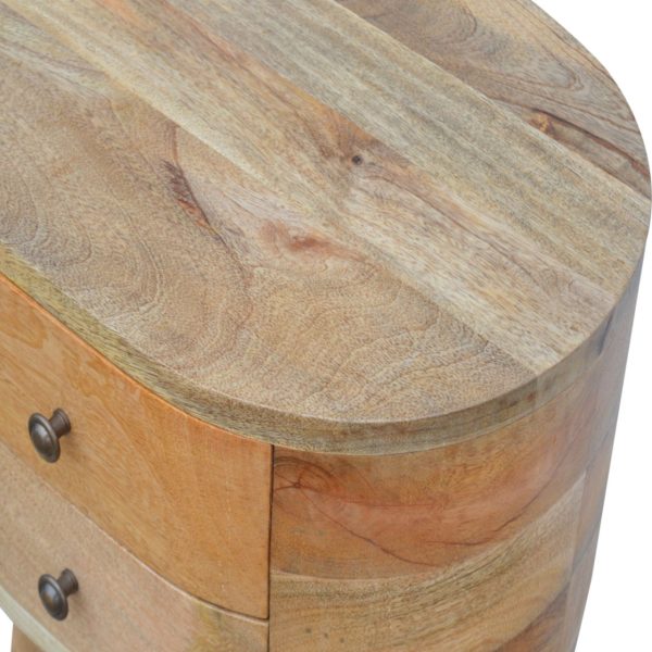 This solid wood bedside has been constructed from 100% solid mango wood in an oak-ish finish and offers a unique shaped design with rounded edges. It features 2 mini drawers which come with a shiny knob and Nordic style legs. A great simple and addition to the bedroom.