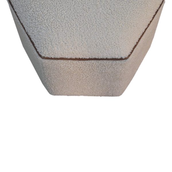 This beautiful and fashionable hexagonal footstool is the perfect addition to any bedroom or living room. It is upholstered in a luxurious cream boucle fabric and has buffalo leather piping around the rim for extra dimension and character, perfect for putting your feet up, using it as a handbag stand, or as an accent piece in the home.