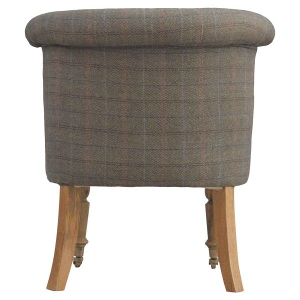 This petite accent chair is beautifully hand-carved from 100% solid mango wood and upholstered in multi tweed. Other features include deep button tufts, 2 caster legs at the front, and 2 tapered legs at the back. All 4 legs have a fine oak-ish finish. You may encounter variations from batch to batch hence if you are looking to pair products under similar room settings; you can opt for a bespoke order or take an informed decision about the possible variations.