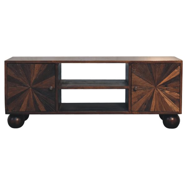 This functional TV unit is designed with shelving and cupboard compartments which have been made from reclaimed wood, that provide convenient storage space for your living room bits. It has been constructed from 100% solid mango wood in a walnut finish with a sunrise pattern followed by shiny brass candle knobs and ball feet. Offering a modern retro aesthetic, this media unit is a timeless option for your home.