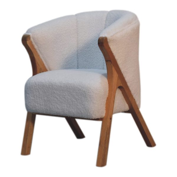 Indulge in comfort and elegance with our white boucle upholstered chair. This versatile piece effortlessly complements bedrooms or study rooms with its simple yet stylish design. Crafted with legs made from 100% solid mango wood in an oak-ish finish, it exudes a touch of rustic charm. Its irresistible appeal is sure to make it a favorite addition to your home.